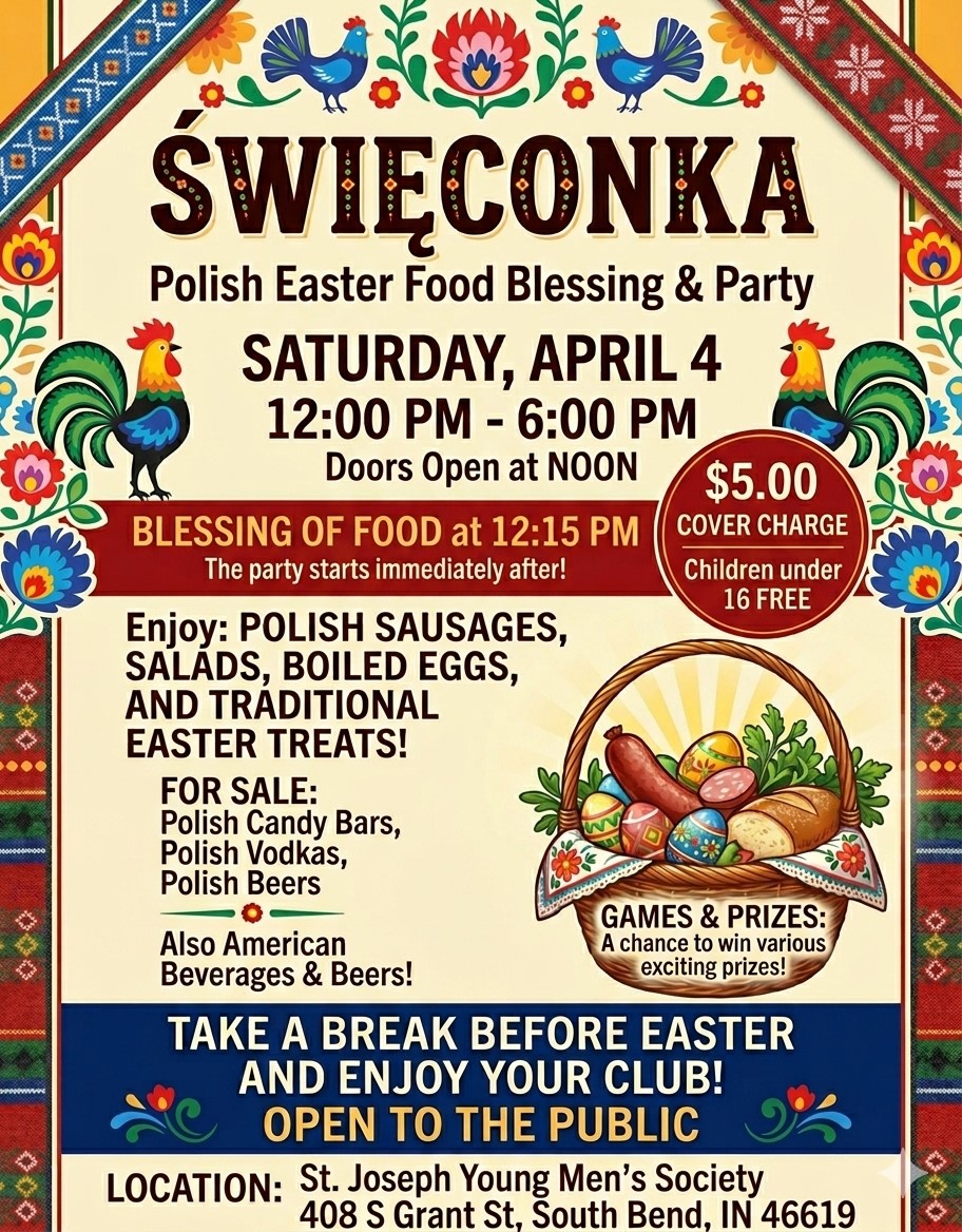 Celebrate Polish Easter traditions at the St. Joseph Young Men’s Society in South Bend with our annual Święconka event on April 4. Enjoy the Blessing of the Food, authentic Polish dishes, family‑friendly activities, and a welcoming community gathering open to the public.
